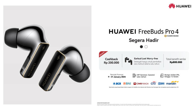 HUAWEI FreeBuds Pro 4 akan tersedia di Indonesia untuk pre-order mulai 9 Januari 2025. Pelanggan yang melakukan pre-order berkesempatan mendapatkan total benefit hingga Rp800.000, yang terdiri dari cashback Rp200.000, VIP Service dengan garansi satu tahun, dan layanan Earbud Lost-Worry Free yang memungkinkan pembelian satu earbuds dengan harga setengah jika hilang atau rusak, berlaku selama satu tahun. Keuntungan ini dapat pelanggan nikmati selama masa promosi hingga 31 Januari 2025.