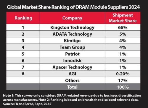 Di tengah tren kebangkitan tersebut, Kingston Technology, pemimpin global dalam produk memori dan solusi teknologi, berhasil mempertahankan posisi teratasnya sebagai pemasok modul DRAM pihak ketiga terbesar di dunia, dengan pangsa pasar sekitar 66%. Laporan TrendForce menegaskan bahwa Kingston kembali menjadi pemimpin pasar global, melanjutkan dominasinya selama 22 tahun berturut-turut.