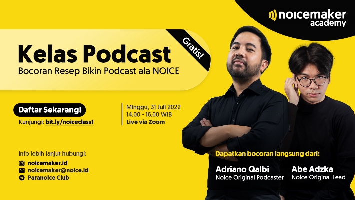 Kelas Podcast terbuka dan dapat diikuti oleh siapapun secara gratis. Sebagai langkah awal, akan digelar Kelas Podcast online pertama pada tanggal 31 Juli 2022. Para kreator pemula yang ingin mengetahui informasi dan mendapatkan edukasi seputar cara membuat podcast yang berkualitas dapat melakukan pendaftaran pada link berikut: bit.ly/noiceclass1. Dalam Kelas Podcast kali ini, akan hadir Adriano Qalbi, yang juga merupakan podcaster Noice Original Musuh Masyarakat dan Happy Broken Family sebagai pembicara yang akan membagikan tips dan trik untuk memproduksi konten podcast dari Abe Adzka, NOICE Original Lead dan Fajrin Sahaf, NOICE Creator Program Lead.