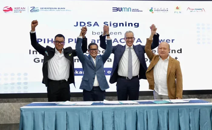 Jakarta, ITECH– PT PLN (Persero) menjalin kolaborasi dengan ACWA Power dan PT Pupuk Indonesia (Persero) untuk pengembangan bisnis hidrogen. Ketiga perusahaan menyusun Joint Development Study Agreement (JDSA) untuk pengembangan green hydrogen sebagai bahan baku amonia di Gresik, Jawa Timur.